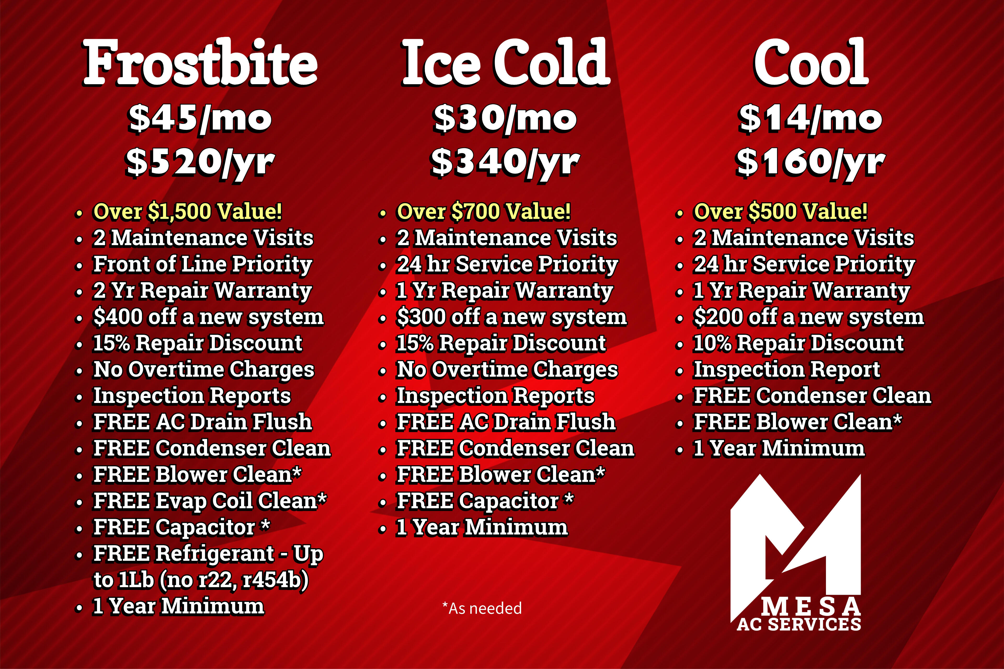 Open 24 hrs Monday- FridayMesa AC Services LLC [email protected] Licensed ROC CR-354885 Bonded • Insured